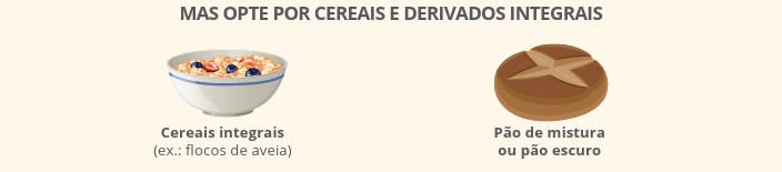 • Deve optar por cereais integrais, ricos em vitaminas do complexo B, mineirais e fibras;